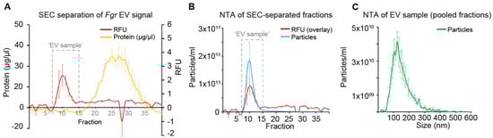 The elution of the EVs from the SEC column was monitored by fluorescence from the lipid-bound FM5–95 dye (Figure 1A). Fractions 7–15 were thus pooled and named “EV sample”. The fluorescence signal aligned with particle number from the NTA analysis (Figure 1B), which revealed an average particle concentration of 4.3 × 1010 particles/mL of pooled fractions (2.2 × 1011 particles/L of culture), and an average particle size of about 120 nm (n = 2, Figure 1C). Most of the soluble protein eluted after the EV sample, in fractions 17 to 35 (Figure 1A). The heat-treated Fgr cultures and sterile YNB+ medium did not significantly increase the particle number of the EV samples (Figure S1).