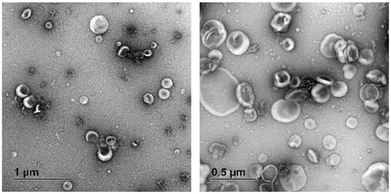 TEM of the EV sample revealed particles partially dehydrated by the uranyl acetate treatment [30], that had the typical cup-like morphology (Figure 2) similar to EVs from other organisms, such as S. cerevisiae and C. albicans [16,17,18,19,20,21,22,23,24,25,26,27,28,29,30,31,32,33,34,35,36,37,38,39,40,41,42,43,44].