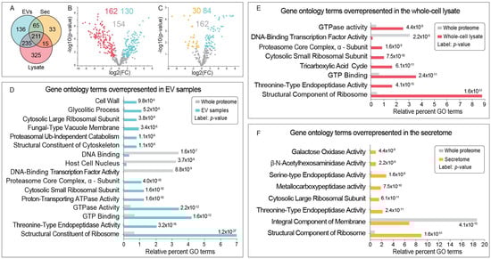 Thirty of the 324 proteins detected in the secretome were more abundant in the secretome compared to the EVs (Figure 3C). The five most abundant were a putative endoglucanase, mannitol 2-dehydrogenase, a putative small-secreted cysteine-rich protein (SSCRP), prenyl xanthone synthesis protein C-like, and galactose oxidase. Most of the proteins in the secretomes had annotated roles in metabolism of carbohydrates, hydrolysis, or oxidoreduction (Table S3). The GO analysis revealed that, compared with the complete Fgr proteome, more proteins in the secretomes had peptidase functions (Figure 3F). The GO analysis of the whole-cell lysate is also presented (Figure 3E).