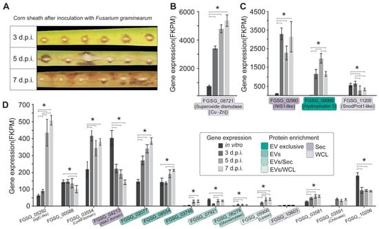 We then asked whether any of these potential effectors are produced during an infection. To determine this, corn plants were inoculated with Fgr and tissue samples were taken at 3, 5, and 7 d.p.i. for transcriptome analysis (Figure 4A). The infected corn tissue and Fgr mycelium, grown in vitro, returned 14,790 transcripts expressed in the infected corn tissue at one or multiple timepoints. For better interpretation, the genes encoding these transcripts were divided into relatively high (Figure 4B), medium (Figure 4C), and low expression (Figure 4D). Superoxide dismutase [Cu-Zn] transcripts were highly expressed with FKPM values around 5000, while transcripts for secreted effector NIS1-like, hydrophobin 3, and SnodProt1-like had medium expression with FKPM values between 3000 and 500. Transcripts of the uncharacterized effector candidates (Table 3) had relatively low expression (Figure 4D). The statistical analysis of gene expression for individual replicates is presented in Tables S4 and S5, respectively.