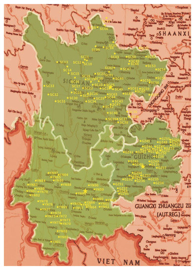 Soil samples were collected in different habitats, including crop, forest, grassy, orchard and arable. The longitude and latitude in each site were recorded by ICEGPS 100C (Shenzhen, China). From each site, approximately 100 g soil beneath the ground 10–15 cm in three randomly selected points were collected and mixed as a sample stored in a plastic bag at 4 °C for further use. The total 212 samples were collected from 133 sites in three provinces, Sichuan, Yunnan and Guizhou of Southwest China (Figure 1).