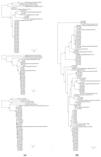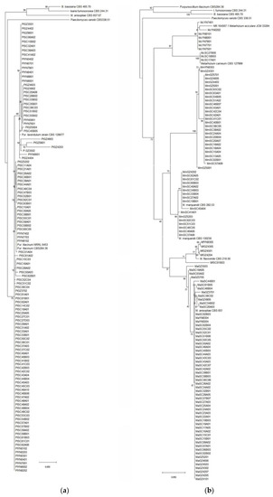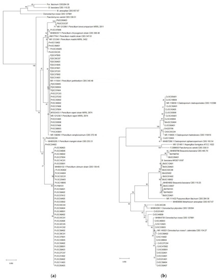(a) Phylogenetic tree of the Penicillium spp.; (b) Phylogenetic tree of Beauveria/Cladosporium/Clonostachys spp.
