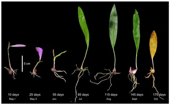 Pleione bulbocodioides is a perennial herb that grows on mossy rocks or humus-covered soil. It is characterized by one solitary pink to pale purple flower and only one papery leaf on an annual ovoid pseudobulb. The fresh roots and one new shoot emerge at the side of the pseudobulb in late spring and then the leaf and new pseudobulb develop while the old pseudobulb shrinks gradually after flowering. The leaf and roots wither and the old pseudobulb shrivels in late October (about 175 days later after emergence), while the new pseudobulb goes into dormancy in the seasonal cold and dry conditions (Figure 1).