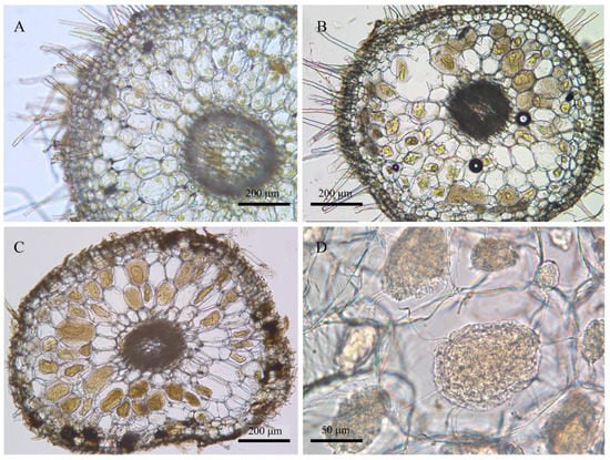 Morphology of root transections of Pleione bulbocodioides. (A) Emergent root (observed in late May, ca. 7 mm long); (B) elongated root (late August); (C,D) aging root (late October).