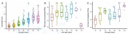 Variations of root length (A), putative mycorrhizal fungal richness (B), and endophytic fungal richness (C) with root age of Pleione bulbocodioides. Different letters (a–e) denote significant differences among the seven root age groups (post hoc Tukey–Kramer honest significant difference test, p < 0.05).