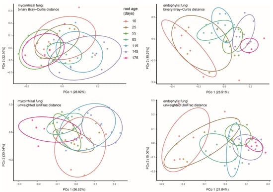 According to the results of the PCoAs (Figure 4), OMF communities were not well separated between age groups. The results of Permanova (Table 1) showed that OMF compositions between adjacent ages were mostly similar, except that significant differences were detected in the three initial stages (10, 25, and 55 days) of root growth. However, the discrepancies between the youngest roots (10 and 25 days old) and aging roots (175 days old) were not statistically supported. Endophytic fungal communities in the 10, 25, and 55 days old roots showed differences with each other, those of 85 to 145 days old roots were not significant, while the aging roots had fungal compositions significantly different from those in 145 days-old roots and the youngest roots. In both the binary Bray–Curtis and unweighted UniFrac PCoAs, the endophytic fungal compartments of the youngest roots and older roots (e.g., 145 and 175 days old) separated across the first principal coordinate, indicating that the endophytic fungi changed with root age.
