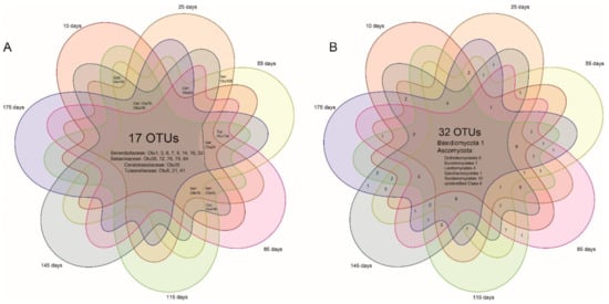 Venn diagrams for putative mycorrhizal (A) and endophytic (B) fungal OTUs of Pleione bulbocodioides.