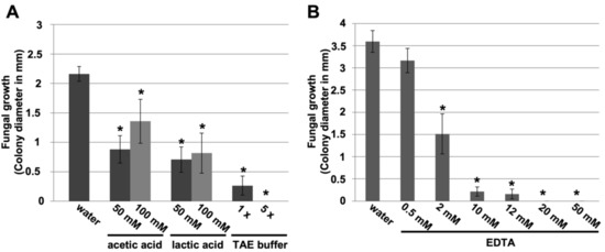 Once the fundamental role of chitin deacetylases in P. xanthii development was demonstrated, we next asked whether the application of chitin deacetylase inhibitors would also have a negative impact on disease development. For that, we tested different concentrations of small carboxylic acids, known inhibitors of chitin deacetylase in vitro [34], such as acetic acid, lactic acid, or combinations such as TAE (Tris-acetate-EDTA) buffer, using a leaf disc assay (Figure S2A). The inhibition of fungal growth was observed in all cases, and the most remarkable effect was that of TAE buffer (Figure 3A). Since the effect of acetic acid was not very pronounced, we studied in detail the effect of EDTA (ethylenediaminetetraacetic acid), the other carboxylic acid present in TAE buffer. Compared with the other compounds, the effect of EDTA was dramatic at 20 mM, causing 100% inhibition of fungal growth (Figure 3B).