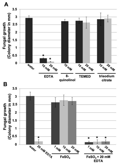 Nondisease-suppressing effect of other chelating agents and disease-suppressing effect of EDTA in presence of metal ions against cucurbit powdery mildew. Melon cotyledon discs were exposed to the different treatments and inoculated with P. xanthii as described in the Materials and Methods. Powdery mildew symptoms expressed as the P. xanthii colony diameter (in mm) were recorded 12 d after pathogen inoculation. (A) Effect of the chelating agents EDTA, 8-quinolinol, TEMED (tetramethylethylenediamine), and trisodium citrate on powdery mildew. (B) Effect of ferrous ions (FeSO4) on EDTA disease suppression. EDTA was combined with different concentrations of FeSO4. Data represent the means of ten samples from two independent experiments, with error bars representing the standard error. The asterisks indicate a statistically significant difference between the treatment and the negative control (water) according to an LSD test (p = 0.05). See Figure S2 for representative pictures. Data for 20 mM 8-quinolinol are not shown, because it is phytotoxic at this concentration.