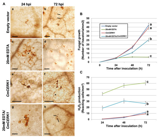 Effect of EDTA on fungal growth and production of hydrogen peroxide. Melon plants were treated with EDTA as described in the Materials and Methods. For RNAi silencing, melon cotyledons were agroinfiltrated, inoculated with P. xanthii 24 h after infiltration, and treated with EDTA 24 h after inoculation. Silencing of the melon chitin receptor gene CmCERK1 was carried out to interfere with host chitin signalling. An empty vector was used as a negative control for RNAi silencing experiments. (A) Visualization of fungal structures and H2O2-producing cells. Detection of hydrogen peroxide was performed by the 3,3′-diaminobenzidine (DAB) uptake method. Pictures were taken at 24 and 72 h after inoculation with P. xanthii. Arrowheads indicate P. xanthii haustoria; arrows indicate P. xanthii hyphae, and asterisks indicate reactive epidermal cells with H2O2 accumulation. Bars = 50 μm (e,f), 100 μm (a,b,g,h), and 200 μm (c,d). (B) Estimation of fungal growth by haustorial counting. The growth of P. xanthii is expressed as the number of haustoria per mm2 of transformed tissue. The values are the means of 30 samples from three independent experiments ± standard error. (C) Time course analysis of the accumulation of H2O2 in melon cotyledons. Detection of H2O2 was performed by the DAB uptake method. The reactive epidermal cells were identified as those containing brown–red precipitates (asterisks). Data represent the number of reactive cells per mm2 and are the means of 30 samples from three independent experiments ± standard error. Values with different letters in (B,C) are significantly different at p = 0.05 according to Fisher’s least significant difference test (LSD).