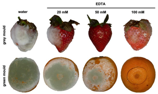 Disease-suppressing effect of EDTA on strawberry grey mould and citrus green mould. The fruits were inoculated with spore suspensions of B. cinerea (grey mould) or P. digitatum (green mould) as described in Material and Methods and were treated with different EDTA solutions 8 h after pathogen inoculation of the pathogen. Pictures were taken 5 (grey mould) or 6 (green mould) days after inoculation.