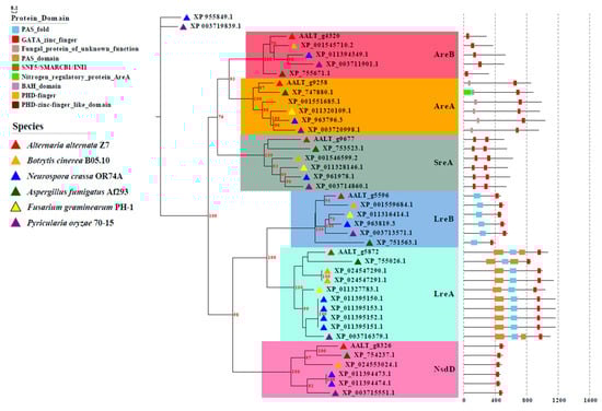 Using A. nidulans GATA sequences as a query to carry out a genome-wide search for GATA proteins in the A. alternata genomic database (GenBank accession no. GCA_001572055.1; http://www.zjudata.com/alternaria/blast.php/, 11 August 2020) retrieved six homologous proteins named AaAreA, AaAreB, AaLreA, AaLreB, AaNsdD, and AaSreA. The protein domain analysis based on the InterPro database (https://www.ebi.ac.uk/interpro/, 12 August 2020) revealed that AaAreA (OWY57112), AaAreB (OWY51034), and AaNsdD (OWY45364) contain only one ZnF_GATA domain. AaSreA (OWY58354) contains two ZnF_GATA domains separated by 105 amino acid residues. AaLreB (OWY43847) contains a PAS domain in the N terminus and a ZnF_GATA domain in the C terminus. AaLreA (OWY44150) contains three PAS domains and a ZnF_GATA domain. The sequence alignment and phylogenetic analysis of the GATA protein homologs of different fungi showed that the domains of different GATA proteins are highly conserved among filamentous fungi. Amino sequences of AreB and LreB in A. alternata were most similar to those of Botrytis cinerea (Figure 1). To gain insight into the functions of AaGATA proteins, each of the six genes encoding respective AaGATA proteins was independently deleted using the homology recombination strategy. More than 10 fungal transformants of each gene were identified and grown on PDA amended with hygromycin. Successful deletion in the respective gene was examined by PCR with gene-specific primer pairs (Figure S1). For each gene deletion, at least three hygromycin-resistant transformants were tested for phenotypes, revealing that all the test transformants from the same gene deletion displayed similar deficiency phenotypes (Figure S2). Only one representative of each gene is shown.