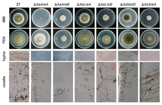 AaGATA transcription factors are involved in growth and development in A. alternata. Colony morphology was observed by incubating Z7 (wild-type), ΔAaAreA, ΔAaAreB, ΔAaLreA, ΔAaLreB, ΔAaNsdD, and ΔAaSreA on PDA or MM at 26 °C for 7 days and photographed. Hyphae, after being grown on PDA slab agars for 36 h, were examined microscopically. Bar = 10 μm. Conidial formation was observed after induction on V8 juice agar in the dark for 8 days. All tests were repeated at least twice with three replicates of each treatment.