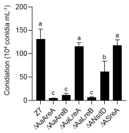Quantitative analysis of conidia produced by A. alternata strains. The wild–type Z7, ΔAaAreA, ΔAaAreB, ΔAaLreA, ΔAaLreB, ΔAaNsdD, and ΔAaSreA strains were grown on V8 juice agar at 26 °C in the dark for 8 days. All tests were repeated at least twice with three replicates of each treatment. Same letters indicate non–significant difference estimated by Duncan’s test (p ≤ 0.05).