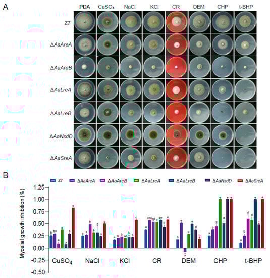 AaGATA transcription factors are required for stress resistance. (A) Mycelial plugs (5 mm) of Z7, ΔAaAreA, ΔaaAreB, ΔaaLreA, ΔaaLreB, ΔaaNsdD, or ΔaaSreA were inoculated on PDA or PDA containing 1 mM CuSO4, 1 M NaCl, 1 M KCl, 250 mg/mL Congo red, 2 mM diethyl maleate (DEM), 1 mM cumyl hydroperoxide (CHP), or 2 mM tert–butyl–hydroperoxide (t–BHP) for 7 days. (B) Growth inhibition rate was calculated. After 7–day inoculation, the diameter of colonies was measured to calculate the growth inhibition rate. Same letters in same stress item indicate non–significant difference estimated by Duncan’s test (p ≤ 0.05). All tests were repeated at least twice with three replicates of each treatment.