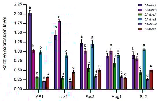 The quantitative RT-PCR analyses revealed that the deletion of AaLreA, AaNsdD, or AaSreA decreased the expression of AP1 (encoding an oxidative stress regulator), ssk1 (encoding a stress response regulator), and Slt2 (encoding a MAP kinase involved in the maintenance of cell wall integrity). The deletion of AaLreA, AaNsdD, or AaSreA also decreased the expression of two MAP kinase-coding genes, Fus3 and Hog1. The deletion of AaAreA increased the expression of AP1 and, to a lesser extent, ssk1 and Fus3, but had no or little effect on the expression of Hog1 and Slt2. The deletion of AaAreB increased the expression of ssk1 but had no effect on the expression of AP1, Fus3, Hog1, or Slt2. The deletion of AaLreB had no effect on the expression of the test genes (Figure 5).