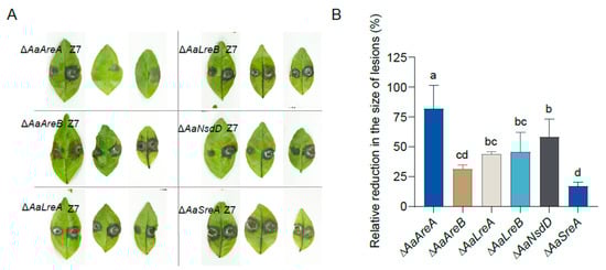 To determine the roles of AaGATA proteins in fungal virulence, detached ‘Hongjv’ leaves were inoculated with mycelial plugs taken from Z7 or various AaGATA mutants. The results indicated that Z7 caused typical brown necrosis around the inoculated point 3 days post-inoculation (dpi). The ΔAaAreB and ΔAaSreA strains induced necrotic lesions at a rate and magnitude comparable to those for the wild-type, whereas ΔAaAreA, ΔAaLreA, ΔAaLreB, and ΔAaNsdD induced significantly smaller lesions compared to those induced by the wild-type (Figure 6A). The quantitative analysis revealed that the sizes of the necrotic lesions induced by the ΔAaAreA, ΔAaLreA, ΔAaLreB, and ΔAaNsdD were reduced by 82%, 44%, 46%, and 59%, respectively, when compared to those induced by the wild-type (Figure 6B). The AaAreA complementation strain displayed wild-type virulence (Figure S2).
