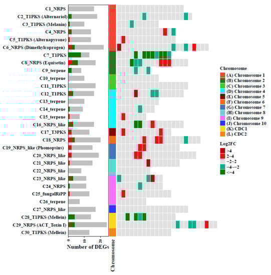 A. alternata is an economically important plant pathogen, which has been reported to cause diseases in over 100 plant species. Many A. alternata pathotypes are necrotrophic fungi, which have evolved to develop the ability to secrete host selective toxins (HST), which can kill host cells before invasion and colonize various economically important crops, such as Japanese pear, strawberry, tangerine, apple, tomato, rough lemon, and tobacco [25,26]. The tangerine pathotype of A. alternata is an important citrus pathogen, which causes Alternaria brown spot on tangerines, grapefruit, and their hybrids, resulting in yield losses [27]. This pathogen initiates its infection by producing an HST termed ACT (A. citri toxin), which is mainly synthesized by proteins encoded by multiple ACT genes located on the ACT biosynthesis gene cluster [26,27]. It has been well known that the genes involved in ACT biosynthesis are clustered in a small, conditionally dispensable chromosome [28,29]. In addition to ACT, the ability to produce cell-wall-degrading enzymes (CWDEs) and detoxify reactive oxygen species (ROS) is crucial for the successful penetration and colonization of A. alternata [30,31,32,33].