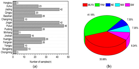 In the present study, 340 wheat-based products were randomly collected from Shanghai markets, including supermarkets, chain stores, and farm product markets, in all 16 city districts. The number of samples from every district is shown in Figure 2a. The wheat samples in Shanghai mainly originates from MLYV (35.9%), YHV (41.2%), NE (7.35%), NW (7.35%), and SW (2.9%), as shown in Figure 2b. The wheat samples from MLYV and YHV together represent 77.1% of the total. This is not surprising, as these are currently the main wheat-producing areas in China [28].