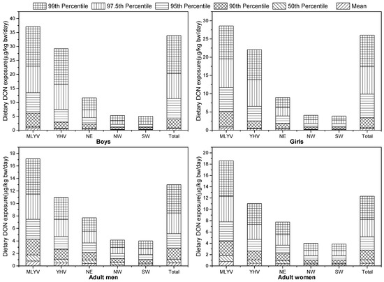 However, the 90th percentiles of dietary exposure for boys from MLYV (4.55 µg/kg bw/day), YHV (2.11 µg/kg bw/day), NE (1.42 µg/kg bw/day), and total samples (3.01 µg/kg bw/day) were all above the PMTDI. The 97.5th percentiles from NW and SW for seven- to 10-year-old girls were 1.19 and 1.10 µg/kg bw/day, respectively, also exceeding the PMTDI. For girls, the 90th percentiles of dietary exposure from MLYV, YHV, NE, and total samples were 4.10, 1.90, 1.28, and 2.71 µg/kg bw/day, respectively, which were all above the PMTDI as well. Additionally, the 97.5th percentile of DON exposure from NW (1.08 µg/kg bw/day) and the 99th percentile from SW (1.10 µg/kg bw/day) were higher than the PMTDI. Similarly, the 90th, 95th, 97.5th and 99th percentiles of dietary exposures for adults from MLYV, YHV, total samples, the 95th, 97.5th, and 99th percentiles of dietary exposures for adults from NE and 99th percentiles of dietary exposures for adults from NW were above the PMTDI. The results indicate that extreme DON exposure values do pose risks. The risk of DON intake through products from MLYV is higher than that from the four other areas. Seven- to 10-year-old children showed higher levels of dietary DON intake than adults.