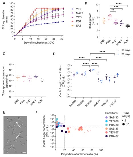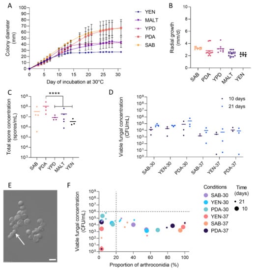 3.3. Production of Arthroconidia Is Highly Variable According to Strains and Culture Conditions