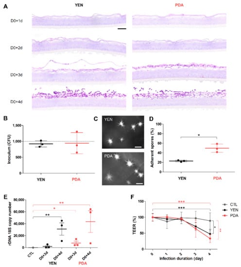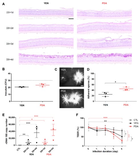 Initially, the inoculum used in our model of infection on RHE consisted in a suspension of spores recovered after a 21-days incubation on YEN at 30 °C under 12% CO2 [28]. Based on our previous results, herein, we compared inoculum prepared using this conventional procedure with a spore suspension recovered after a 10-days incubation on PDA at 30 °C under 12% CO2, appearing as the optimal method to obtain a high viable fungal concentration. The preparation of these spore suspensions was performed as described in Section 2.4. Spores were stored at 4 °C and used within one month.