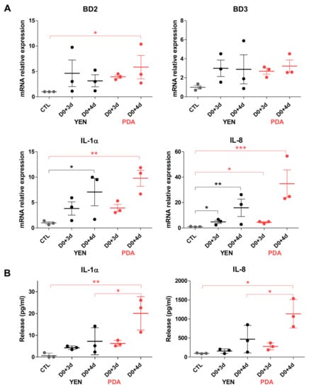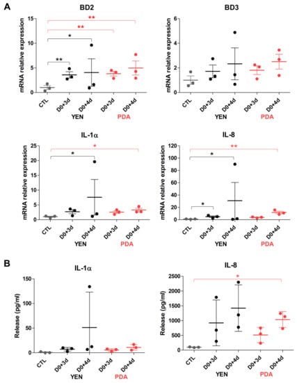 Keratinocyte responses to the infection of RHE by dermatophytes were assessed through measurements of mRNA expression and release in the culture medium of several pro-inflammatory cytokines (IL-1α, IL-1β, IL-8 and TNFα) and antimicrobial peptides (β-defensin-2 (BD2) and -3 (BD3) and cathelicidin LL-37) (Figure 5, Figure 6 and Figure S11). Since a previous report from our team has shown that keratinocyte responses mainly appear near the end of the infection period [29], the expression and release of these factors were monitored on the third and fourth days following infection of the RHE. In accordance with previously obtained results, keratinocytes expressed and released proinflammatory cytokines and antimicrobial peptides mainly on the fourth day following infection, and at similar level whatever the procedure used for spore production, either on YEN or on PDA. However, the variability of keratinocyte responses using the inoculum produced on YEN was very high between replicate assays. This factual observation that has already been reported [29] remains difficult to explain and monitor. In contrast, the reproducibility of the observed keratinocyte responses was improved and quite satisfactory with the inoculum produced on PDA.