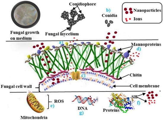As mentioned before, several factors influence the antifungal activity of the nanoparticles. Therefore, it is necessary to know the interaction and action mechanism between the metal nanoparticles and the phytopathogenic fungi. At present, various possible antifungal action mechanisms of these nanoparticles have been proposed (see Figure 1).