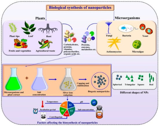 Ag nanoparticles have been extensively investigated in different scientific fields due to their antioxidant, antimicrobial, and anticancer properties as well as their characteristics of biocompatibility, easy production, relatively low cost, and non-toxicity, among others [66,67,68,69,70,71,72]. Due to these properties and their effective antifungal activities, Ag nanoparticles have also been the most investigated nanoparticles to control phytopathogenic fungi [73,74]. The main synthesis methods used to produce Ag nanoparticles to inhibit the growth of phytopathogenic fungi are the chemical and biological routes because they are easy to acquire and handle. In Figure 2, a generalized representation of the green or biological synthesis of metallic nanoparticles is illustrated. It can be observed that several factors can influence the synthesis of nanoparticles.