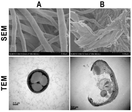 Microscopic images of SEM and TEM of F. graminearum in the absence (A) and presence (B) of the synthesized silver nanoparticle [116].