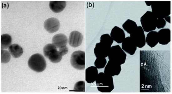 Cu nanoparticles synthesized with different shapes and sizes: (a) spherical shapes [158] and (b) faceted shapes [152].