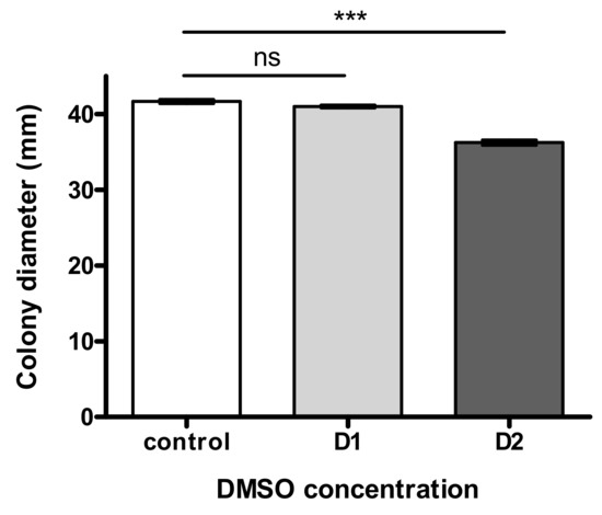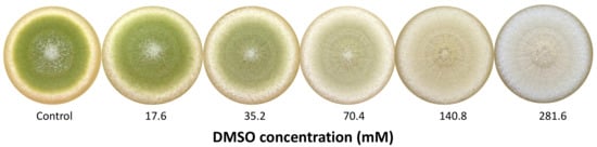 - Carley, H.E.; Watson, R.D.; Huber, D.M. Inhibition of Pigmentation in Aspergillus niger by Dimethylsulfoxide. Can. J. Bot. 1967, 45, 1451–1453. [Google Scholar] [CrossRef]