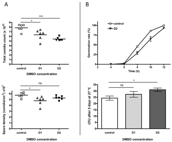 - Bean, G.A.; Rambo, G.W.; Klarman, W.L. Influence of dimethyl sulfoxide (DMSO) on conidial pigmentation and consequent UV light sensitivity of aflatoxin producing strains of Aspergillus flavus. Life Sci. 1969, 8, 1185–1191. [Google Scholar] [CrossRef]