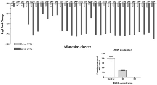 - Bean, G.A.; Klarman, W.L.; Rambo, G.W.; Sanford, J.B. Dimethyl Sulfoxide Inhibition of Aflatoxin Synthesis by Aspergillus flavus. Phytopathology 1971, 61, 380. [Google Scholar] [CrossRef]