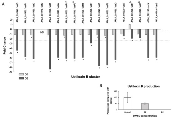 Costes, L.H.; Lippi, Y.; Naylies, C.; Jamin, E.L.; Genthon, C.; Bailly, S.; Oswald, I.P.; Bailly, J.-D.; Puel, O. The Solvent Dimethyl Sulfoxide Affects Physiology, Transcriptome and Secondary Metabolism of Aspergillus flavus. J. Fungi 2021, 7, 1055. https://doi.org/10.3390/jof7121055