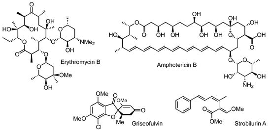 Recent estimates suggest that over 25% of drugs approved between 1981 and 2014 are natural products or directly derived from natural products []. The bacterial polyketide class of compounds constitutes a significant percentage of natural products used in clinical or agricultural settings. This class of compounds includes the antibiotic erythromycin B and the antifungal compound amphotericin B, among many others (Figure 1). Fungi are also prolific producers of valuable antibiotics such as the polyketides griseofulvin and strobilurin A. Industrial production of these compounds often relies on large-scale fermentation and semi-synthesis as the most efficient routes []. Thus, the development of new biosynthetic engineering platforms that can rationally manipulate and improve the production of these compounds is an important current goal.