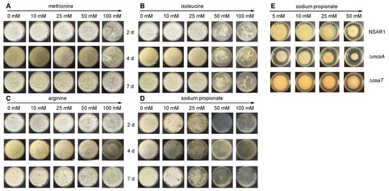 Susceptibility of A. oryzae NSAR1 to different amino acids and propionate at the indicated concentrations and times. (A) Methionine; (B), isoleucine; (C) arginine; (D) sodium propionate; (E) susceptibility of indicated mutants to indicated concentrations of sodium propionate after 5 days.