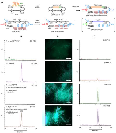 Construction of functional modular PKS in A. oryzae. (A) Construction of vectors; (B) LCMS analysis of A. oryzae NSAR1, standard TKL, and transformants in the absence and presence of propionate as indicated ES+ at m/z 173.0; (C) microscopic images of four A. oryzae NSAR1 transformants showing variability of eGFP intensity; (D) quantitative selective ion monitoring (SIM, ES+ at m/z 173.0) of extracts of the corresponding A. oryzae strains shown in panel C. Scale bars 200 μm.
