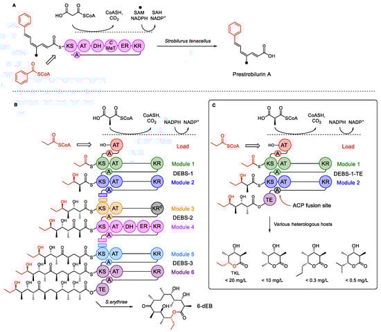 Type I PKS. (A) The iterative PKS involved in the biosynthesis of prestrobilurin A; (B) 6-module DEBS system that synthesizes 6-dEB; (C) engineered DEBS1-TE that synthesizes triketide lactones (TKL). Abbreviations: KS, ketosynthase; AT, acyl transferase; A, acyl carrier protein (ACP); DH, dehydratase; C-MeT, C-methyl transferase; ER, enoyl reductase; KR, keto-reductase; KR0-inactive KR domain; TE, thiolesterase. Diagrams inspired by Keatinge-Clay [].