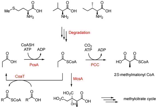 Propionate metabolism relevant to this work. Abbreviations: PcsA, propionyl-CoA synthetase; PCC, propionyl-CoA carboxylase, McsA, methylcitrate synthase; CoaT, acyl-CoA transferase.