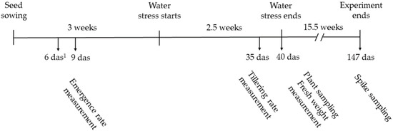 The plant emergence rate was determined at 6 and 9 days, and the results were expressed in percentage. Tillering data were taken on 35-day-old wheat plants (eight plants per treatment and condition). The total shoots of wheat plants were collected at 40 days to determine the fresh weight (four plants per treatment and condition). The plant height and spike weight were recorded on 21-week-old plants (four plants per treatment and condition).