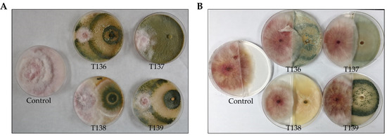 Dual cultures of four Trichoderma strains (T. harzianum T136, T. simmonsii T137, T. afroharzianum T138, and T. harzianum T139) (on the right of each plate) and the pathogen Fusarium graminearum (on the left). (A) Using 8.5 cm Petri plates, and (B) using centrally partitioned 8.5 cm Petri plates. Control corresponds to the pathogen growing alone. The plates were incubated at 28 °C for four days.
