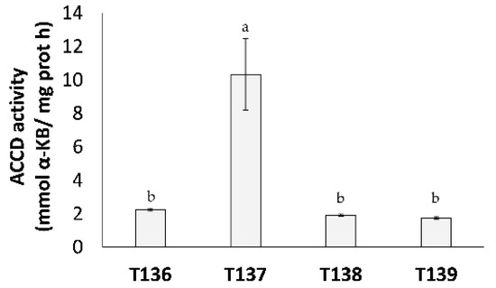 The 1-aminocyclopropane-1-carboxylic acid deaminase (ACCD) activity of four Trichoderma strains (T. harzianum T136, T. simmonsii T137, T. afroharzianum T138, and T. harzianum T139), expressed as millimoles of α-ketobutyrate in 1 h per milligram of protein, in a four day synthetic medium culture. The data were calculated from three replicates for each strain. Different letters above the bars indicate significant differences according to one-way analysis of variance (ANOVA) followed by Tukey’s test (p < 0.05).