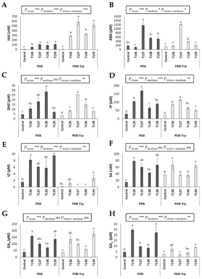 Phytohormone production in two day PDB and PDB-tryptophan (Trp) cultures by four Trichoderma strains (T. harzianum T136, T. simmonsii T137, T. afroharzianum T138, and T. harzianum T139) compared to their respective PDB and PDB-Trp media controls. (A) Indole-3-acetic acid (IAA), (B) abscisic acid (ABA), (C) cytokinin dihydrozeatin (DHZ), (D) cytokinin isopentenyladenine (iP), (E) cytokinin trans-zeatin (tZ), (F) salicylic acid (SA), (G) gibberellin 4 (GA4), and (H) gibberellin 1 GA1 (GA1). The data were calculated from three replicates per strain and culture medium. For each phytohormone and culture medium, different letters above the bars indicate significant differences according to one-way analysis of variance (ANOVA) followed by Tukey’s test (p < 0.05). For each phytohormone, significant effects were determined by a two-way ANOVA for Trichoderma strain, culture medium, and the combination strain per culture medium (***: p < 0.001; **: p < 0.001; *: p < 0.05; ns: no statistical differences).