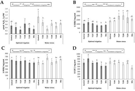 Effect of Trichoderma (T. harzianum T136, T. simmonsii T137, T. afroharzianum T138, T. harzianum T139, and a mixture with these four strains) treatments on (A) H2O2 content, and (B) SOD, (C) POD, and (D) CAT activities in 40-day-old wheat plants that were grown under optimal irrigation and water stress (irrigation was removed for 2.5 weeks when plants were 21 days old) conditions. The data were calculated from four replicates for each treatment and condition (n = 4), and different letters above the bars indicate significant the differences according to one-way analysis of variance (ANOVA) followed by Duncan’s test (p < 0.05). For each set of data, the effect of significance was determined by a two-way ANOVA for Trichoderma treatment, irrigation condition, and the combination treatment per irrigation condition (***: p < 0.001; **: p < 0.01; * p < 0.05; ns: no statistical differences). FW: leaf fresh weight.
