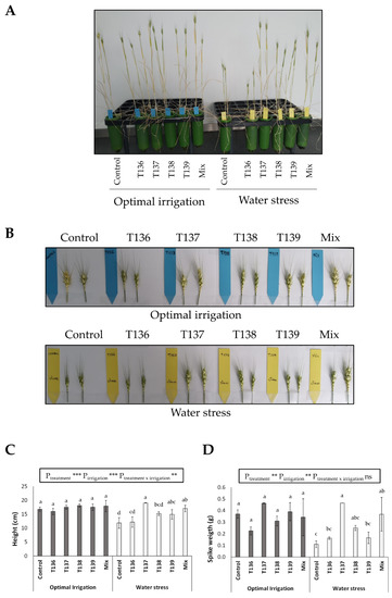 Long-term effect of Trichoderma (T. harzianum T136, T. simmonsii T137, T. afroharzianum T138, T. harzianum T139, and a mixture with these four strains) treatments on Basilio wheat under optimal irrigation and water stress (irrigation was removed for 2.5 weeks when the plants were 21 days old) conditions. Photographs of (A) plants and (B) spikes, taken at 5 months, and values of (C) plant height and (D) spike weight. Data in (C,D) were calculated from four replicates for each treatment and condition (n = 4), and the different letters above the bars indicate significant differences according to one-way analysis of variance (ANOVA) followed by Tukey’s test (p < 0.05). For each set of data, the effect of significance was determined by a two-way ANOVA for Trichoderma treatment, irrigation condition, and the combination treatment per irrigation condition (***: p < 0.001; **: p < 0.01; * p < 0.05; ns: no statistical differences).