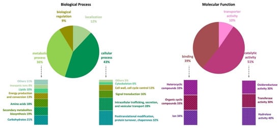 The genome of A. affinis CMG 70 has 11,584 genes annotated according to the NCBI’s nonredundant protein (Nr), UniProt/Swiss-Prot, EggNOG, KEGG, GO, and Pfam databases (Table S1). There are 10,726 (91.2%) cellular proteins and approximately 1037 secreted proteins (8.8%) (Tables S1 and S3). The number of predicted proteins of CMG 70 is similar to that of ATCC MYA-4773T, as well as to what has been reported for other Aspergillus species, which vary from 9078 in A. coremiiformis to 14,216 in A. transmontanensis [34]. Functional analysis (GO, Biological Processes) showed that most genes are involved in cellular (43%) and metabolic process (36%), cellular localization (12%), and biological regulation (9%) (Figure 1, Table S1). Genes classified within the “cellular process” category were mainly classified as being involved in posttranslational modification, protein turnover, chaperones (32%); intracellular trafficking, secretion, and vesicular transport (28%); signal transduction (16%); cell wall and cell cycle control (13%); cytoskeleton (6%); and others (5%), which include defense mechanisms and extracellular structures. Within the “metabolic process” category, A. affinis genes are involved in the metabolism and transport of carbohydrates (21%), amino acids (18%), lipids (10%) and inorganic ions (8%); in the biosynthesis of secondary metabolites (19%); and in energy production and conversion (13%). In GO, Molecular Functions, genes are involved in catalytic (51%), binding (39%), and transport (10%) activities (Figure 1, Table S1). These values are in agreement with what has been described in the literature for fungi.