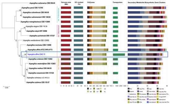 The genome of A. affinis CMG 70 was compared to other sequenced and annotated genomes from 16 species in the section Circumdati (Table 1). The information available in JGI Genome Portal databases such as genome size, GC content, CAZymes, transporters, and BGCs abundance was used to evaluate genetic and metabolic diversity within the section Circumdati. One-way analysis of variance (ANOVA) followed by Student t-test (p < 0.05) was used to determine significant differences in CAZyme family diversity and transporters abundance between species of the three series within the section Circumdati. In addition, a phylogenetic analysis based on Maximum Likelihood using the sequences of the rDNA internal transcribed spacer region (ITS) and tubulin (tub2) of the Aspergillus strains was performed using MEGA7 [30]. Clade stability was assessed using a bootstrap analysis with 1000 replicates. Sequences were aligned with ClustalX version 2.1 [31] using the parameters described in Gonçalves et al. [12]. All alignments were checked and edited with the BioEdit Alignment Editor version 7.2.5 [32].