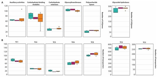 Boxplot representing the diversity of CAZyme family (A) and the abundance of transporters (B) in the section Circumdati: series Sclerotiorum (blue), series Steyniorum (pink) and series Circumdati (orange). In the boxplot, the midline represents the median and the upper and lower limit of the box represents the third and first quartile. One way analysis of variance (ANOVA) followed by Student t-test was used. No significant differences (p > 0.05) were observed.