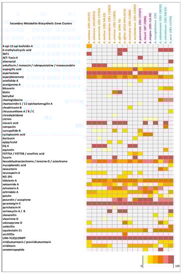 - Nielsen, J.C.; Grijseels, S.; Prigent, S.; Ji, B.; Dainat, J.; Nielsen, K.F.; Frisvad, J.C.; Workman, M.; Nielsen, J. Global analysis of biosynthetic gene clusters reveals vast potential of secondary metabolite production in Penicillium species. Nat. Microbiol. 2017, 2, 17044. [Google Scholar] [CrossRef]